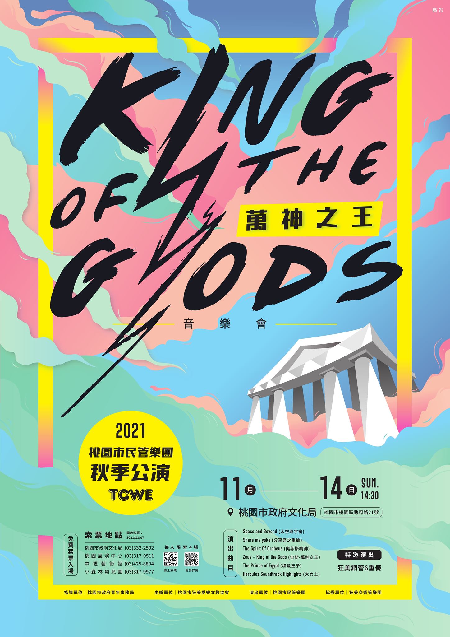 桃園市民管樂團秋季公演《萬神之王》,節目中樂團將帶來多首精彩曲目,除震懾磅礡的太空與宇宙、大力士,經典曲目埃及王子、奧菲斯精神,還有由狂美銅管六重奏帶來精彩的美國隊長、神鬼奇航,各位千萬別錯過了! |