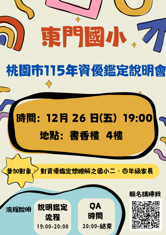 主旨: 有關本校辦理「115學年度國民小學資賦優異學生鑑定家長說明會」一案,詳如說明,請各校所屬二升三及四升五年級學生和家長踴躍報名參加。 說明: